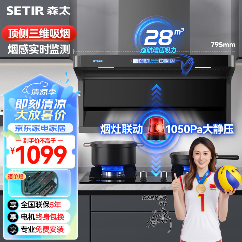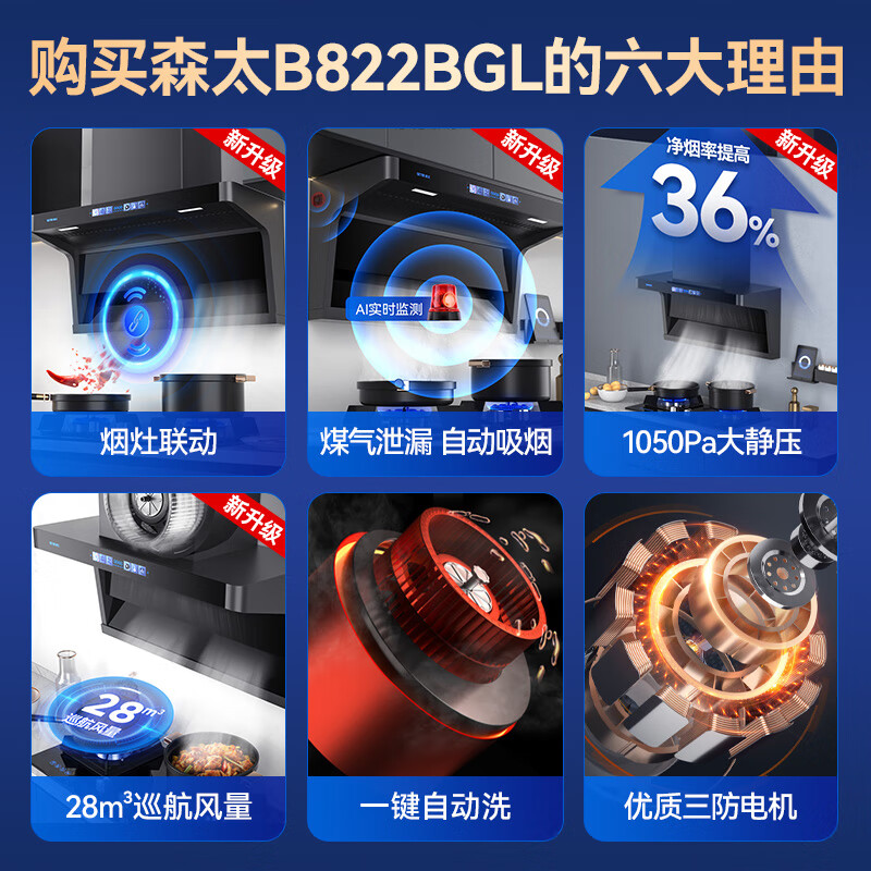 森太(SETIR)顶侧双吸油烟机 7字型抽油烟机 变频小尺寸大吸力烟灶联动厨房家用吸油烟机 CXW-220-B822BGL价格:1299.00元!