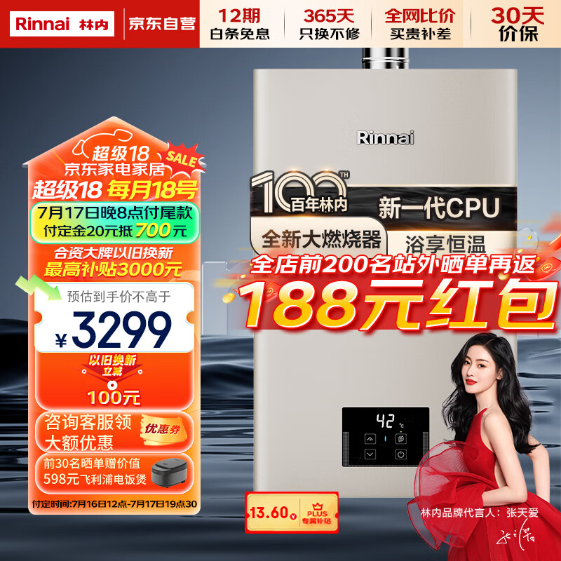 林内(Rinnai)【小蛮腰Pro】16升燃气热水器 全新智慧芯 恒温再升级 天然气热水器16GD32(JSQ31-GD32)以旧换新价格:3299.00元!