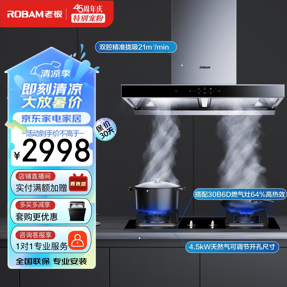 老板(Robam)抽油烟机烟灶套装双腔欧式顶吸21大风量烟机免拆洗家用吸油烟机燃气灶烟机灶具60A1套装(天然气)价格:2998.00元!