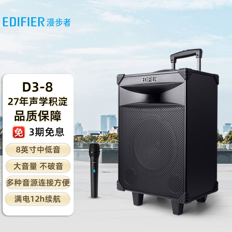 漫步者(EDIFIER)D3-8 8英寸专业广场舞音响 会议音响 蓝牙拉杆音箱 户外音响 标配无线麦克风 精致露营价格:699.00元!