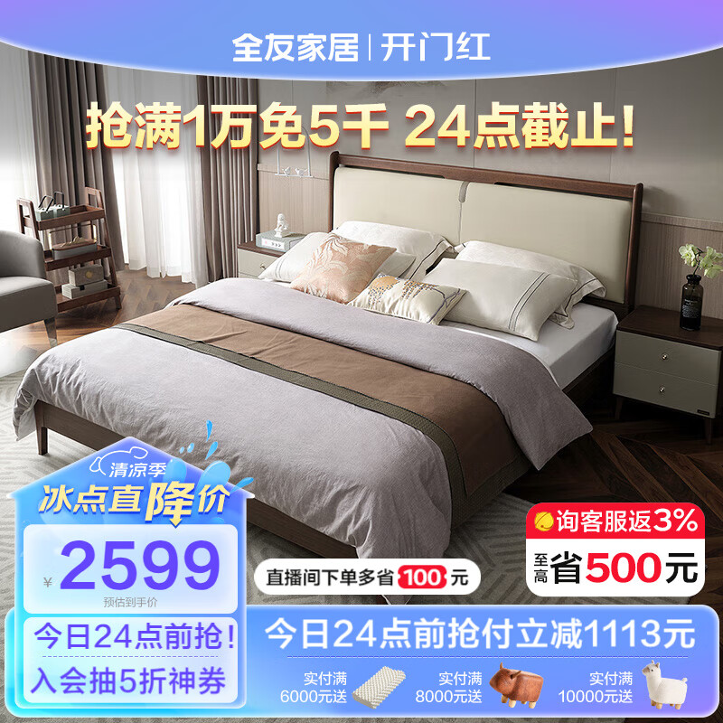 全友家居 新中式床实木脚双人大床主卧室1.5x2米现代轻奢软包床129701价格:3712.86元!