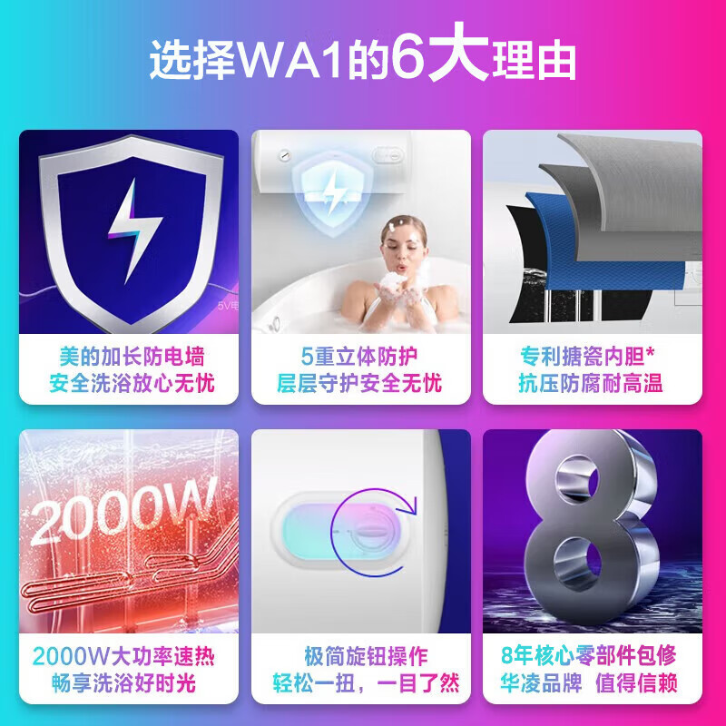 美的(Midea)出品电热水器家用洗澡节能省电恒温家用热水器小体积保温速热加长防电墙搪瓷内胆 50L 华凌WA1适用2-3人价格:799.00元!