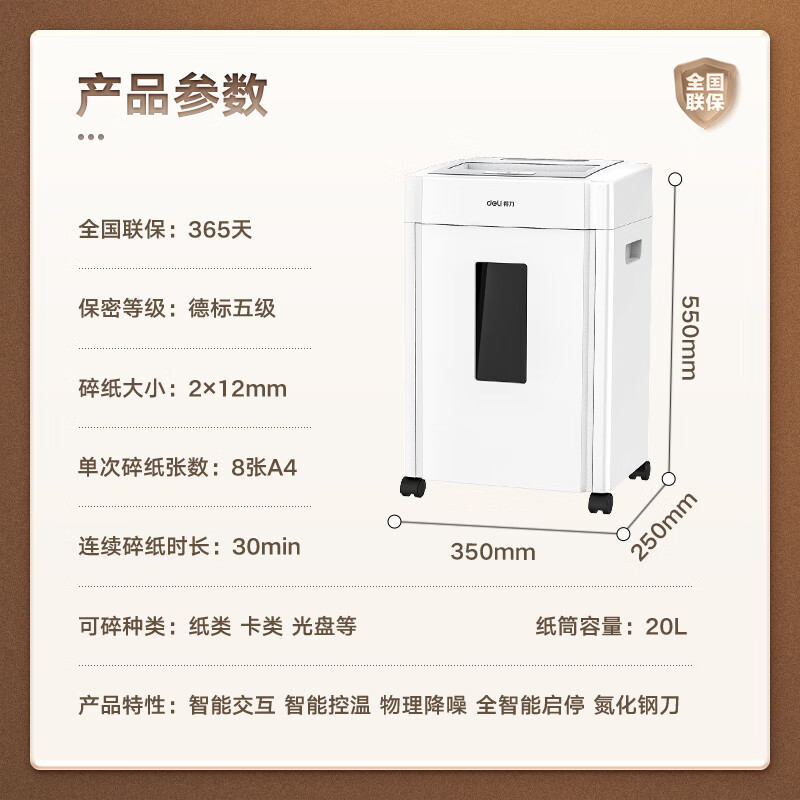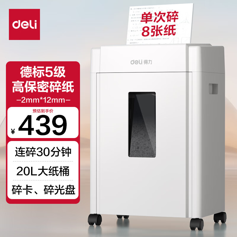 得力5级保密碎纸机33040 旗舰双碎口 商用办公大型碎纸机 文件粉碎(单次8张 可碎光盘 20L 30分钟)价格:479.00元!
