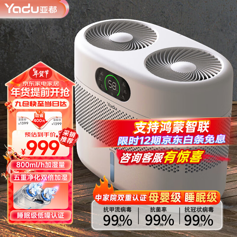 亚都(YADU)双擎无雾加湿器卧室母婴家用办公室蒸发式纯净型800ml/h空气增湿8L大容量上加水SZ750-TJK800(Hi)价格:1099.00元!