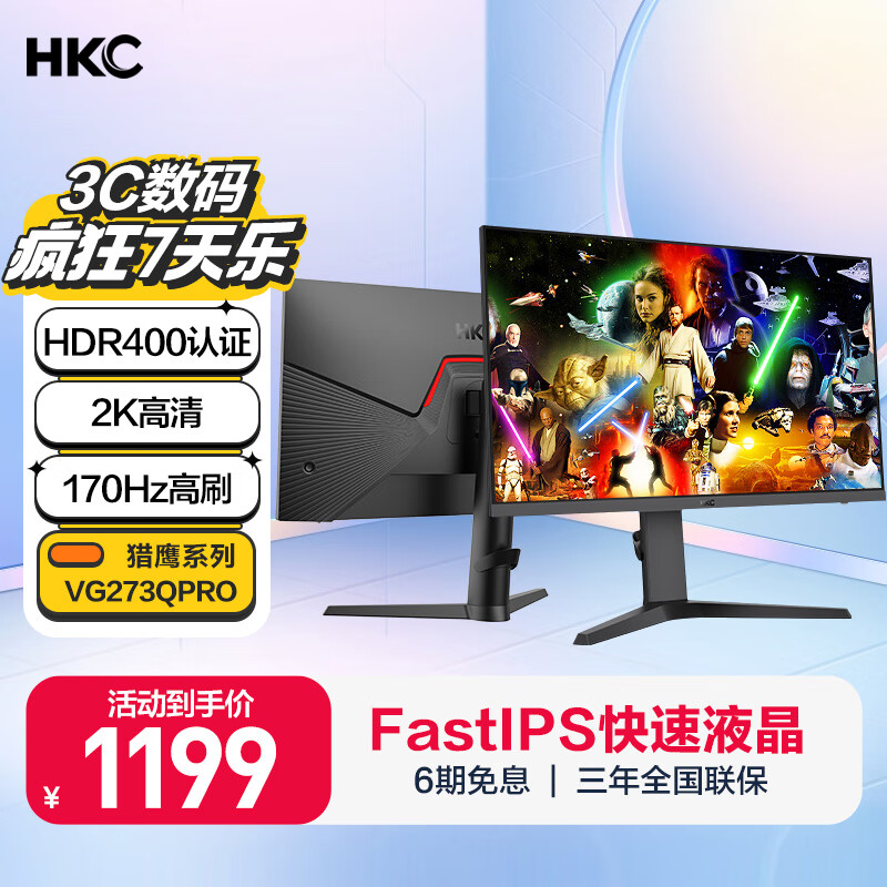 HKC 27英寸2K 170Hz FastIPS快速液晶 HDR400 GTG1ms响应144Hz升降旋转 电竞游戏显示器 VG273Qpro价格:1399.00元!