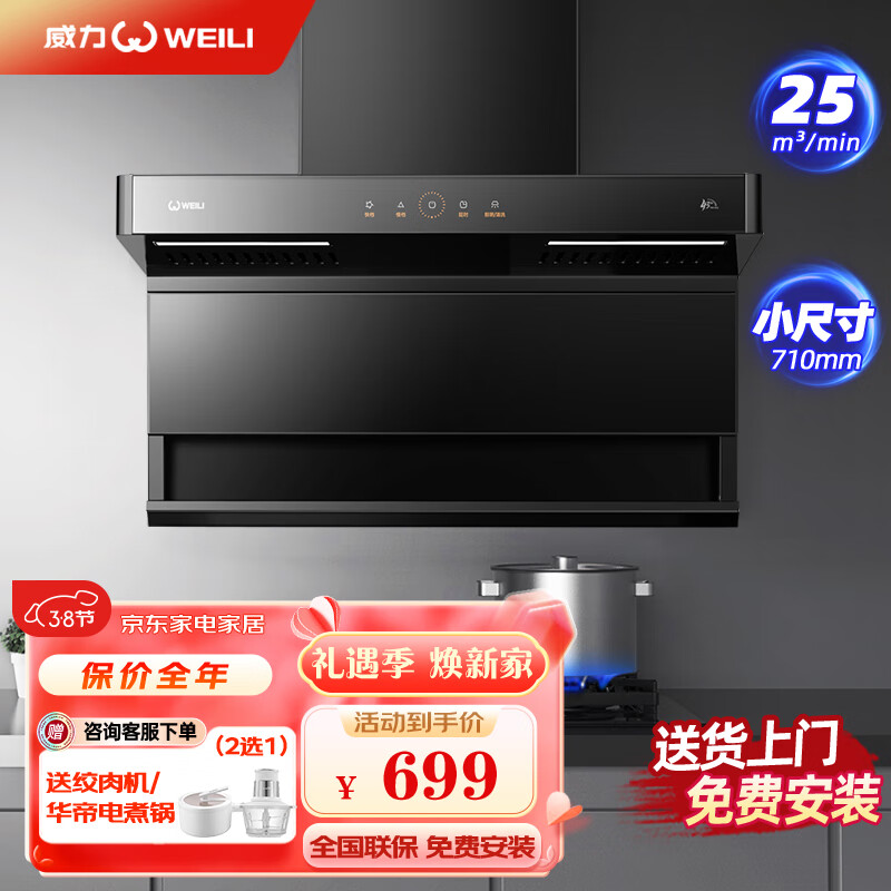 威力(WEILI)顶侧双吸油烟机7字型抽油烟机家用25m3/min爆炒大吸力自动清洗710mm吸烟机WLQ03价格:699.00元!