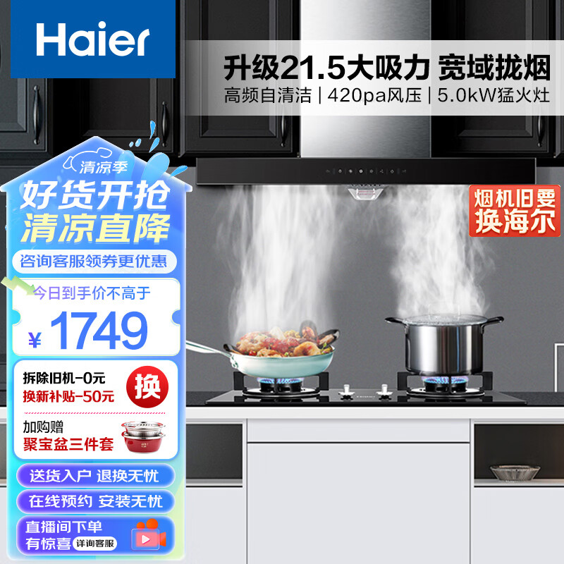 海尔(Haier)抽油烟机 烟灶套装 升级21.5m3/min大吸力 挥手智控自旋洗 欧式家用吸油烟机燃气灶T11+Q2BE2(天)价格:1749.00元!