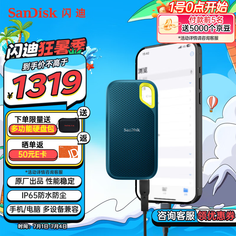 闪迪(SanDisk)2TB Nvme移动固态硬盘(PSSD)E61极速版松柏青SSD 读速1050MB/s 手机直连笔记本外接硬盘价格:1319.00元!