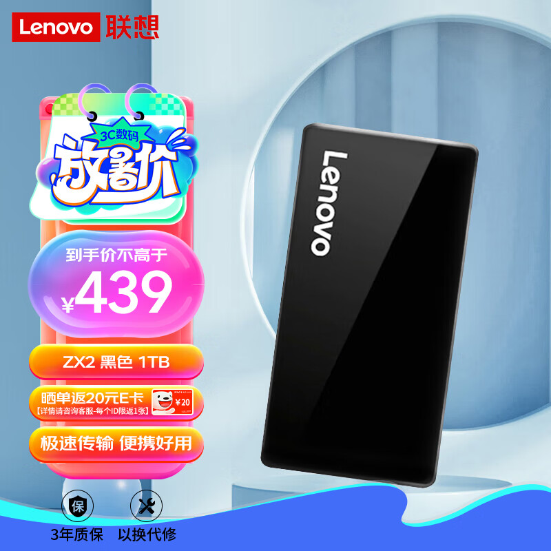 联想(Lenovo)1TB 移动固态硬盘(PSSD)Type-c USB3.1接口 手机直连 ZX2系列 黑色价格:439.00元!