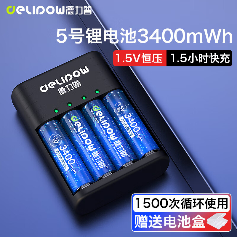 德力普(Delipow)充电电池 5号锂电池3400mWh大容量4节装1.5V恒压配智能快充充电器套装适用玩具/游戏手柄/KTV话筒价格:110.00元!