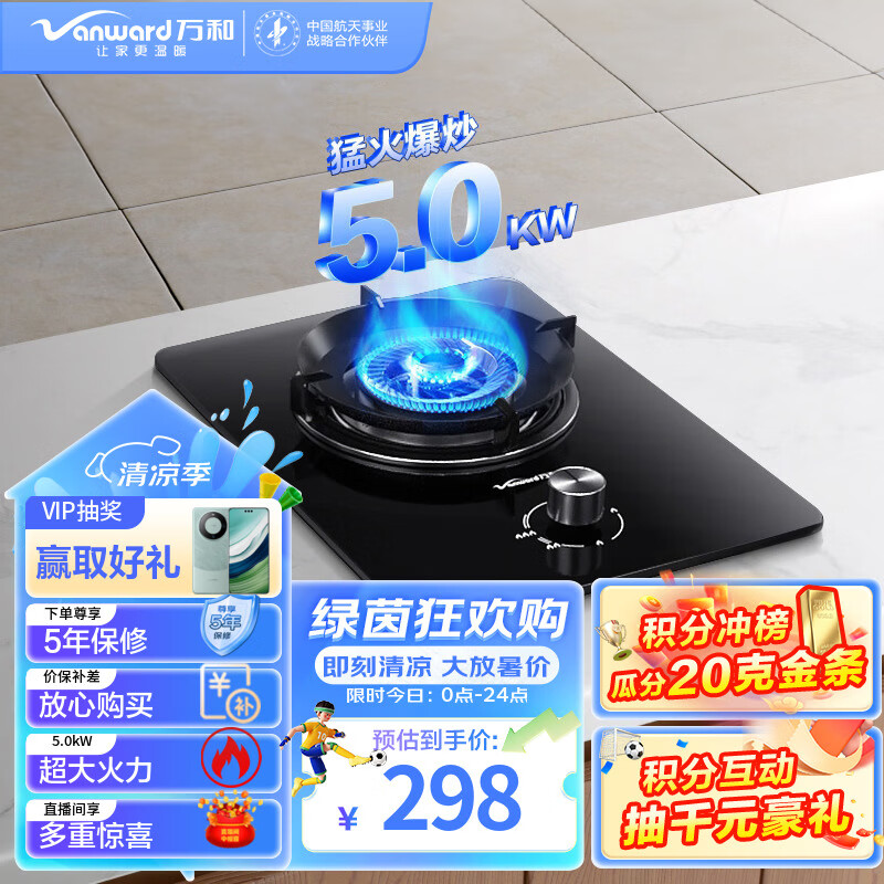 万和(Vanward)钢化玻璃燃气灶单灶具 单眼灶嵌入式 5.0kW大火力 台嵌两用煤气炉煤气灶 JZY-E6L90 液化气价格:298.00元!