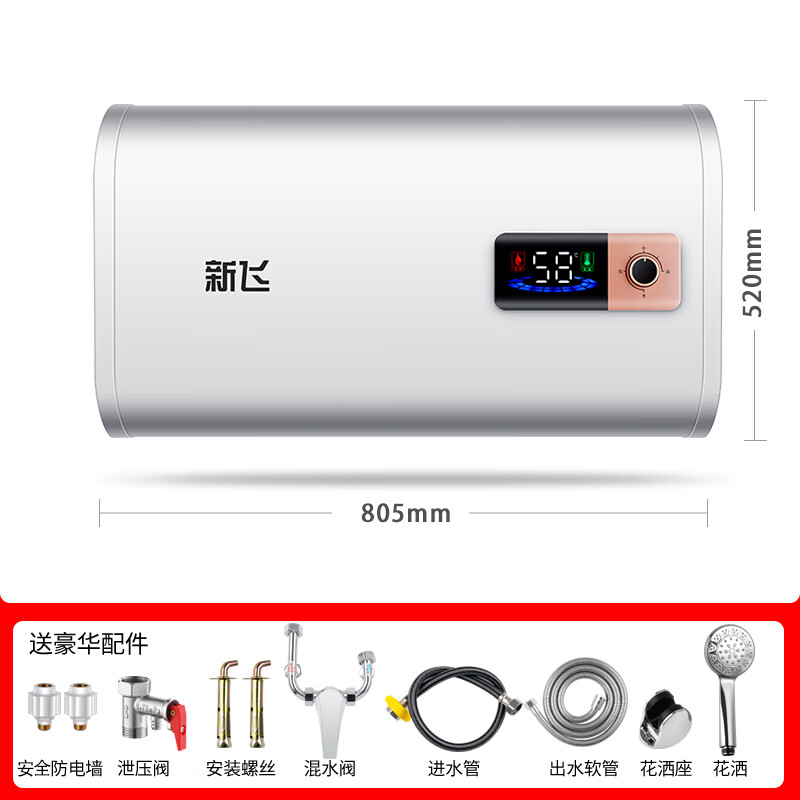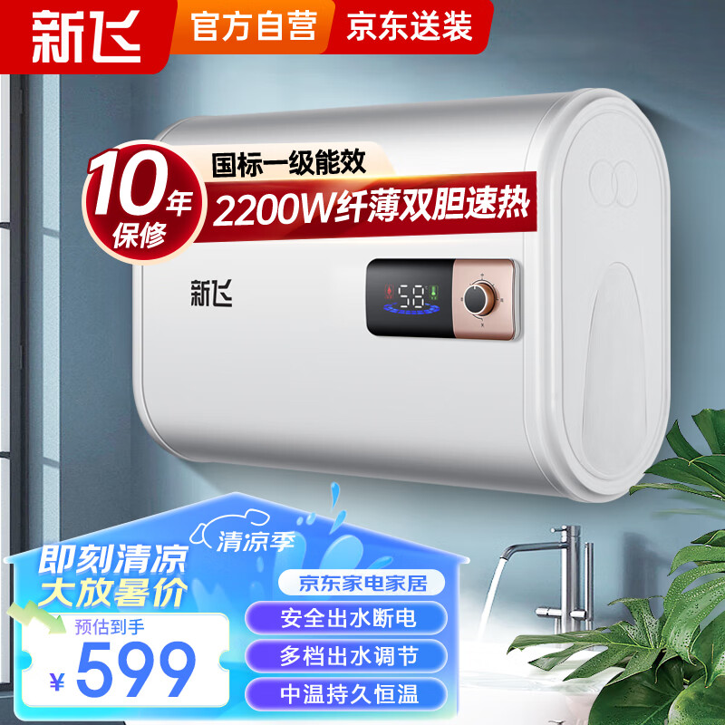 新飞储水式电热水器扁桶60升一级能效2200W节能出水断电双胆速热家用卫生间洗澡恒温租房DSZF-B208-60L价格:799.00元!