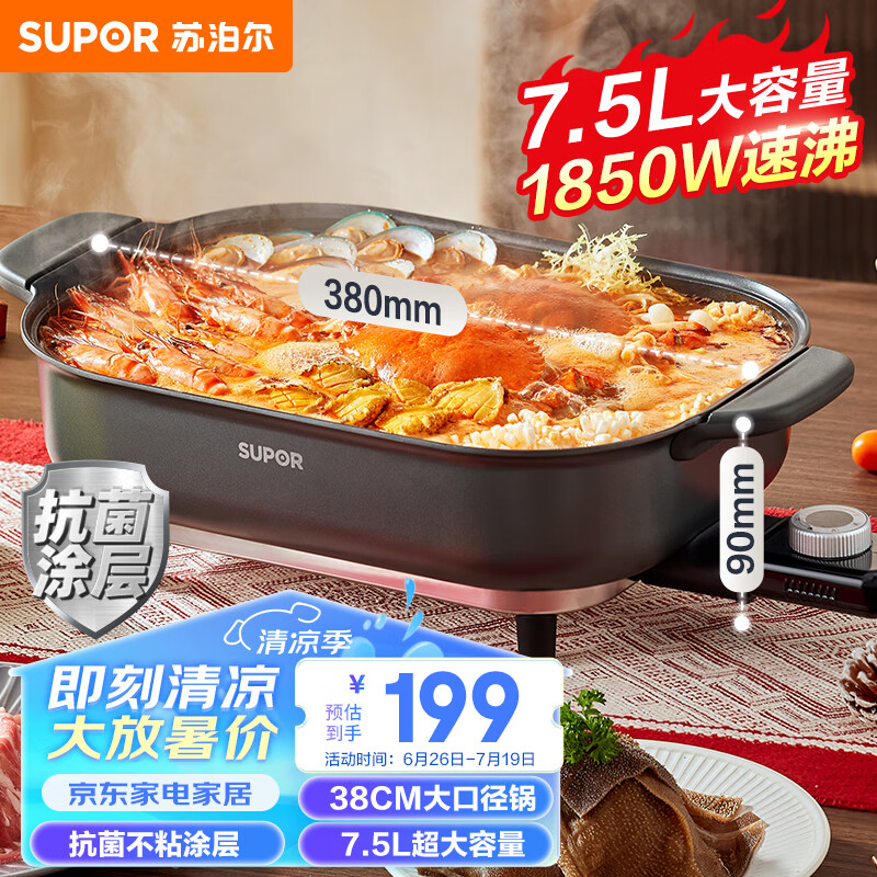 苏泊尔(SUPOR)电火锅 电煮锅 7.5L大容量家用火锅专用锅1850W涮烤一体多功能电热锅烤肉烤鱼锅 H3727FK853价格:199.00元!