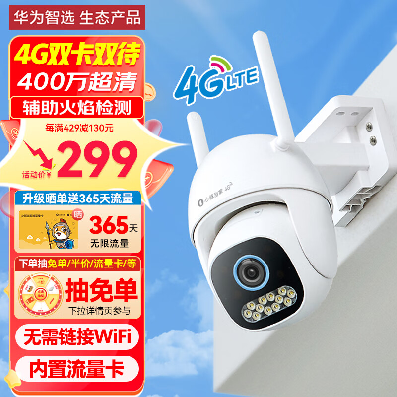 华为智选 小豚当家4G版2.5K室外摄像头家用400万 双卡双待监控器360度无死角带夜视全景户外防水高清可对话价格:429.00元!