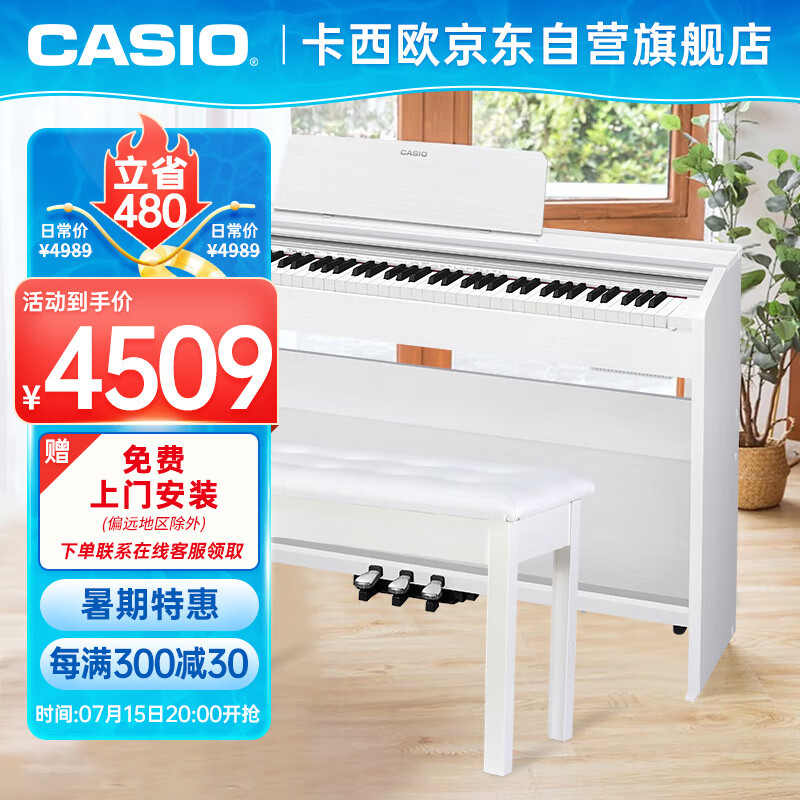卡西欧(CASIO)电钢琴 PX870白色立式成年人儿童88键重锤智能APP互动分享+琴凳价格:4989.00元!