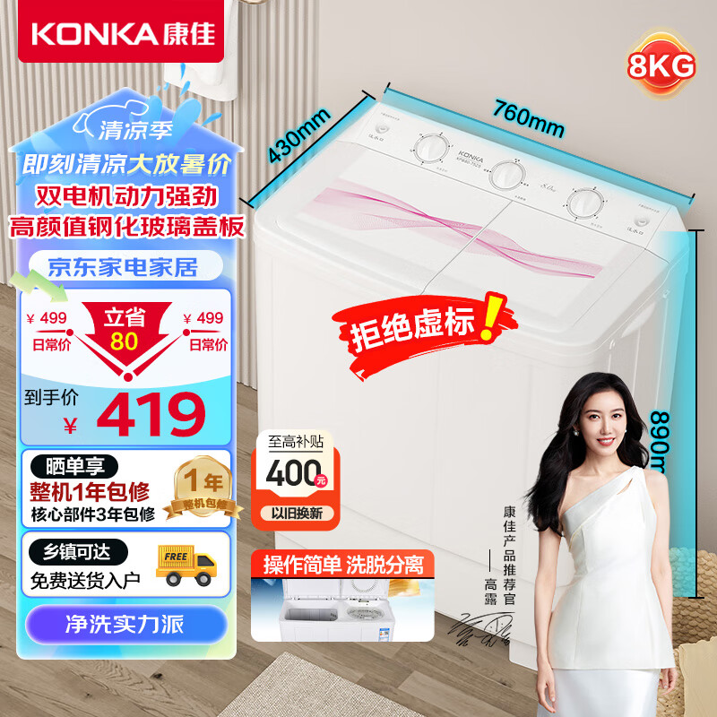 康佳(KONKA)8公斤 半自动波轮洗衣机 大容量 双桶双缸 脱水甩干机 家电(白色)XPB80-752S价格:419.00元!