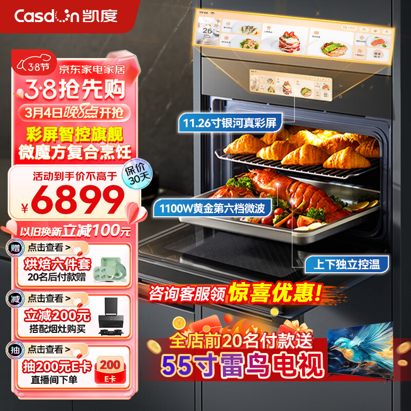 凯度(CASDON)52L 嵌入式 双热风 微蒸烤炸炖5合1 蒸烤箱一体机 彩屏WIFI智控 变频微波SR52FW1-ZRPro价格:6899.00元!