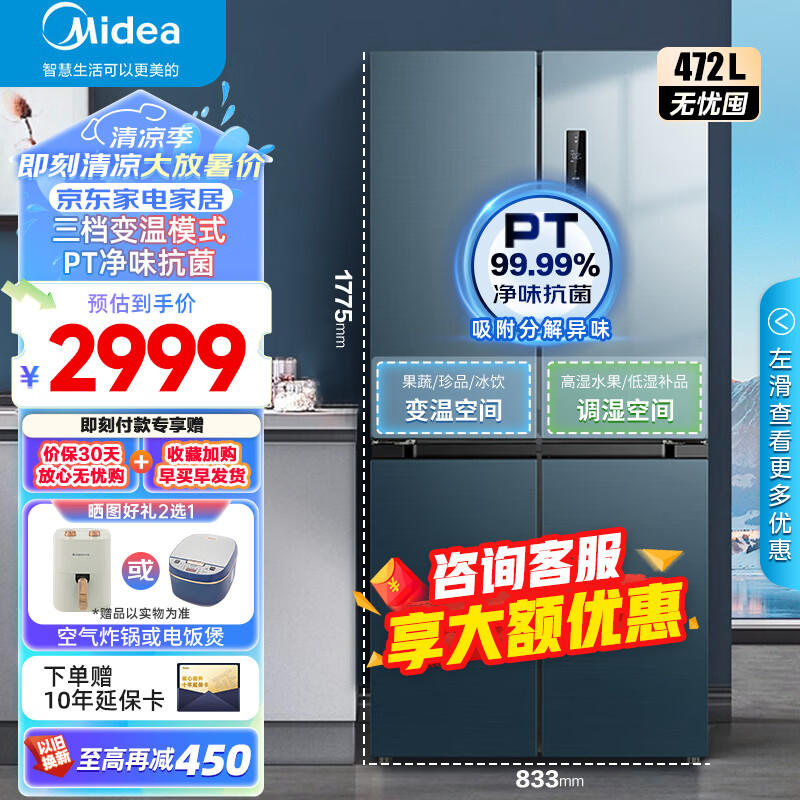 美的(Midea)果润精储472升一级双变频十字双开四开门家用电冰箱京东小家智能家电BCD-472WSPZM(E)超薄大容量价格:3199.00元!