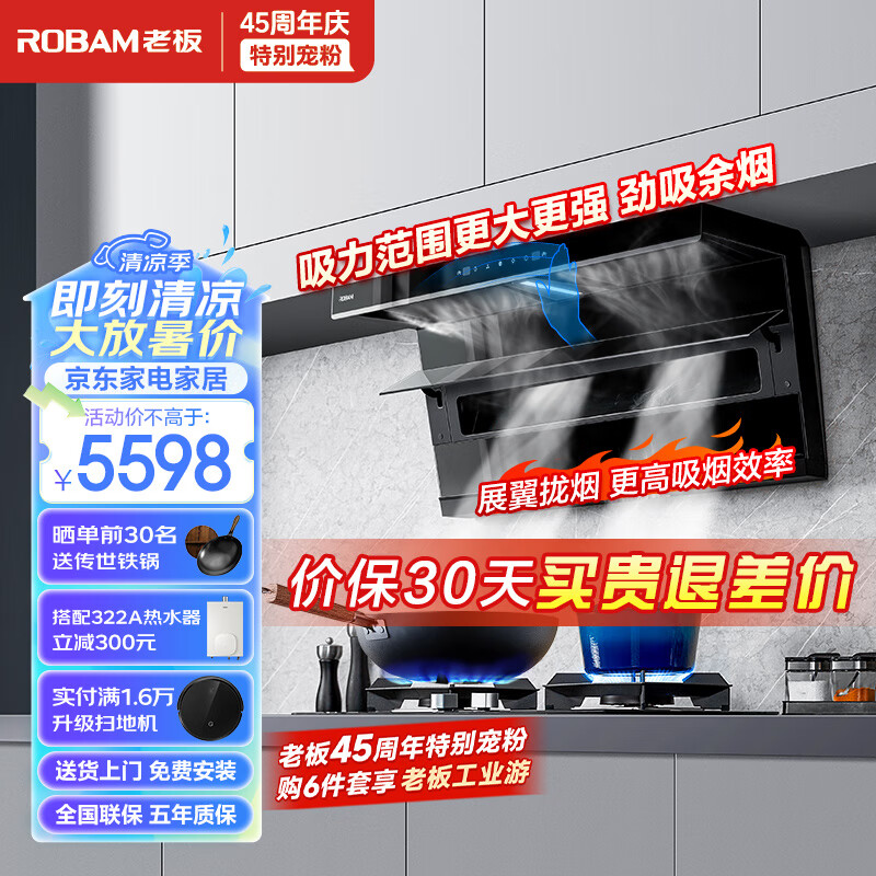 老板(Robam)【李佳琦直播间同款】油烟机小黑翼 顶侧双吸7字型家用大吸力25立方1000pa静压燃气灶烟灶套装 27A13-D1+57B0X烟灶套装价格:5598.00元!