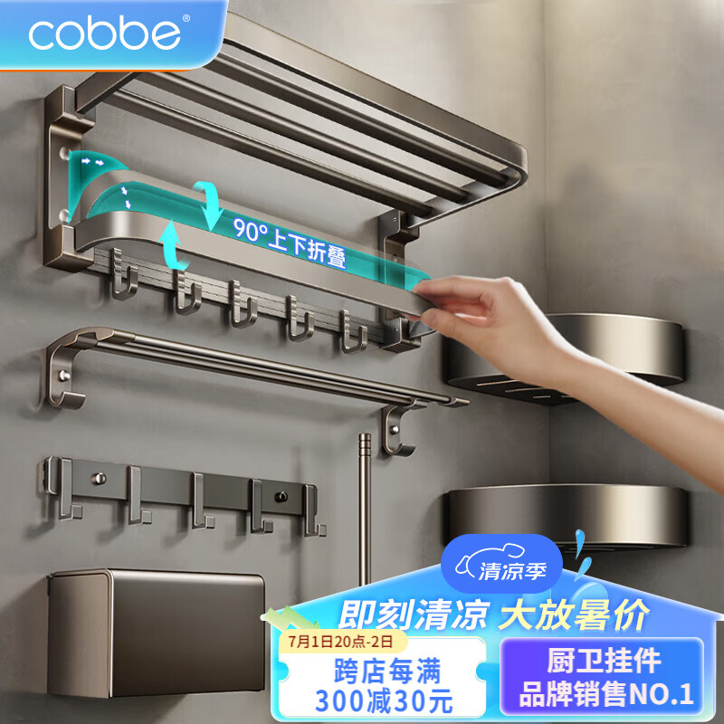 卡贝(cobbe)浴室太空铝毛巾架免打孔卫生间置物架厕所浴巾架卫浴五金挂件套装价格:368.00元!