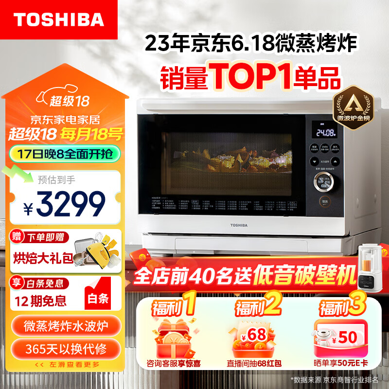 东芝XD95CNW微蒸烤炸一体机水波炉家用台式变频微波炉电烤箱空气炸蒸箱平板隐藏烤管白色26L价格:3299.00元!