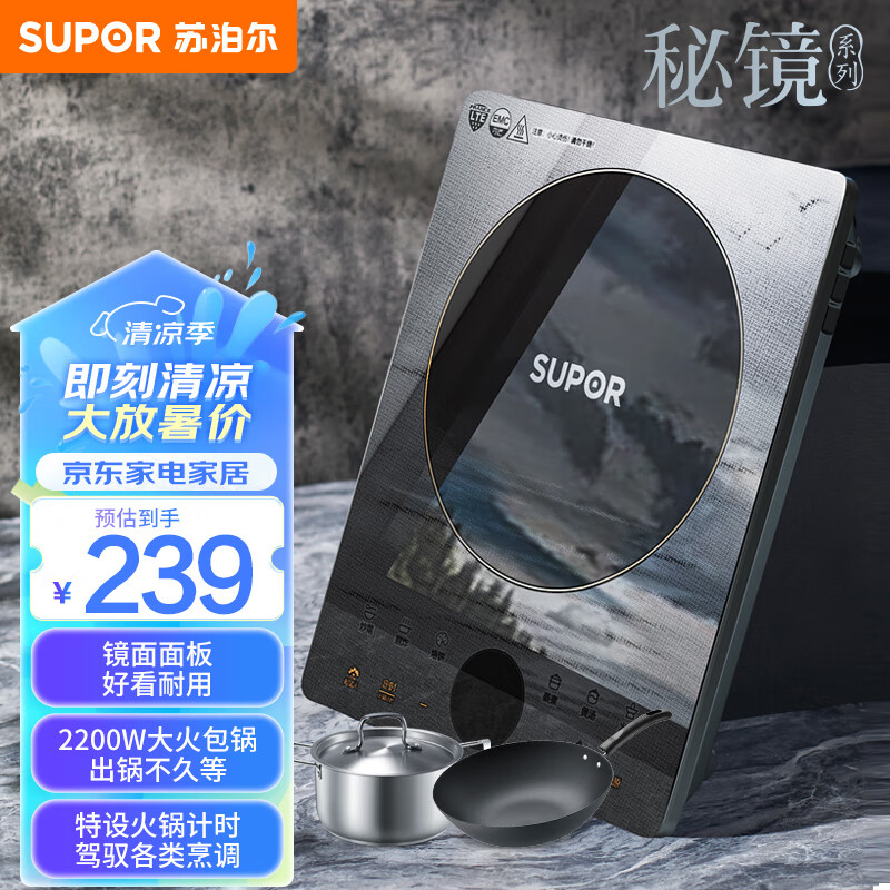 苏泊尔(SUPOR)秘镜系列家用电磁炉 2200W大功率电磁灶火锅炉 爆炒炒菜 火锅定时多功能电磁炉套装带锅C22-IH80E价格:239.00元!