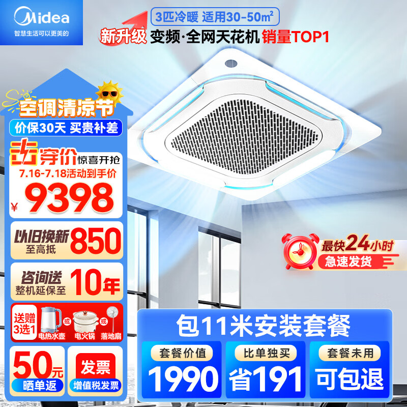 美的(Midea)3匹天花机空调吸顶吊顶空调 商用中央空调嵌入式变频冷暖220V包11米铜管安装RFD-72QW/BDN8Y-D(B3)价格:9398.00元!
