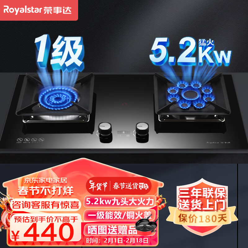 荣事达(Royalstar)燃气灶天然气双灶嵌入式家用5.2KW大火力全铜火盖九头鸳鸯定时钢化玻璃猛火灶具 RSD-R211 天然气价格:440.00元!
