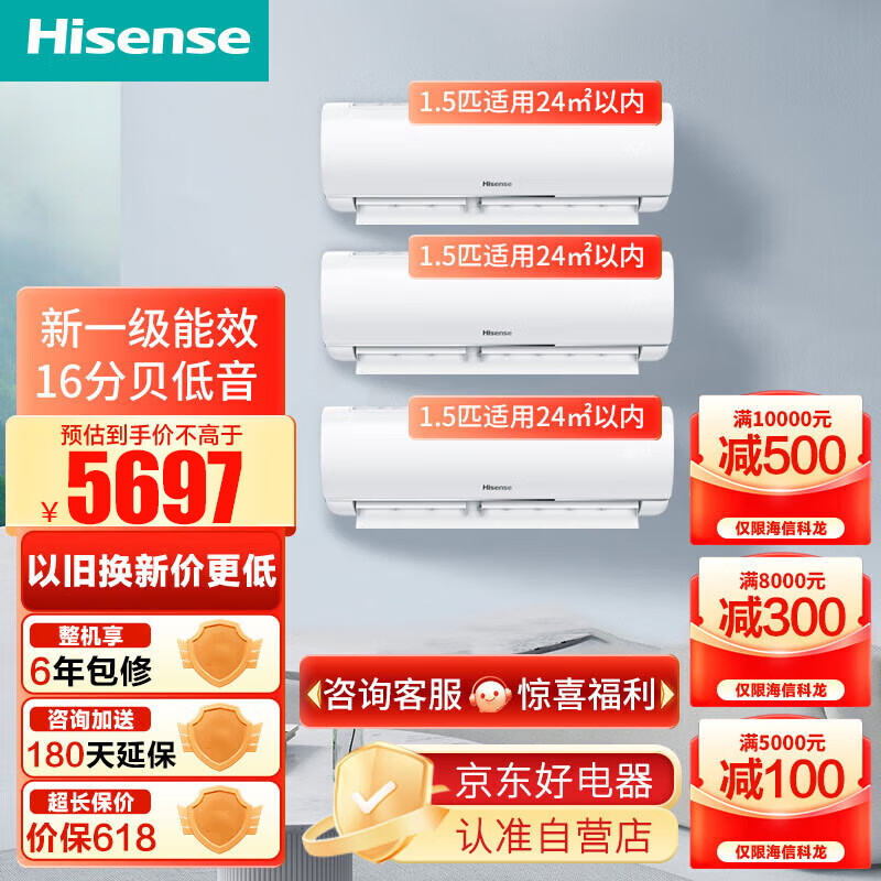 海信(Hisense)1.5匹 新一级变频 空调挂机 速冷热 冷暖智能 低音自清洁卧室壁挂式 3台套装 KFR-35GW/E290-X1价格:6297.00元!