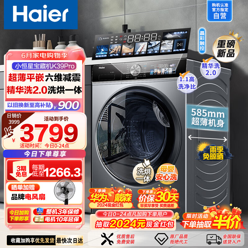 海尔(Haier)10公斤滚筒全自动大容量家用洗烘一体洗衣机K39Pro小恒星精华洗2.0六维减震超薄平嵌12519以旧换新价格:4999.00元!