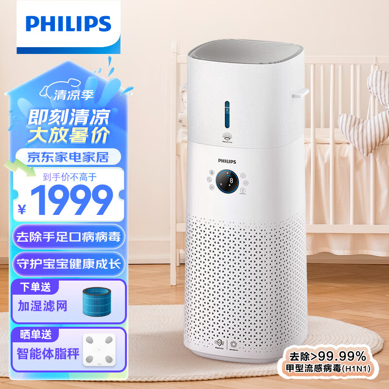 飞利浦(PHILIPS)医护级空气净化器 除过敏原除甲醛除菌除异味 净化加湿二合一无雾加湿智能互联AC3737/00价格:1999.00元!