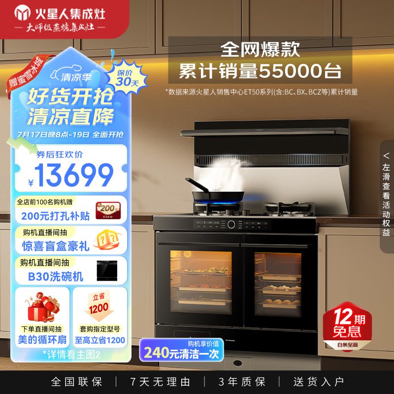 火星人集成灶ET50BCZ 集成灶蒸烤一体 左蒸烤炸右快蒸 家用蒸箱烤箱 燃气灶 液化气价格:13799.00元!