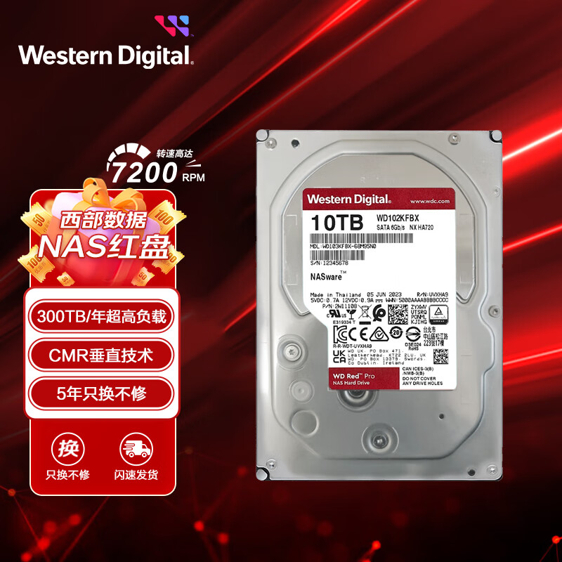 西部数据 NAS硬盘 WD Red Pro 西数红盘Pro 10TB CMR 7200转 256MB SATA 网络存储 私有云常备(WD102KFBX)价格:2499.00元!