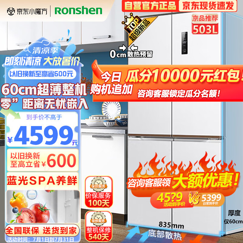 容声(Ronshen)60厘米薄零嵌入式503升十字对开四开门冰箱家用一级能效变频底部散热超薄大容量BCD-503WD1FPQ价格:5599.00元!