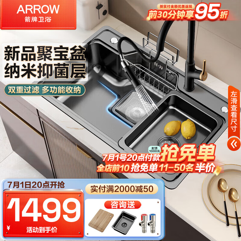箭牌(ARROW)水槽聚宝盆304不锈钢一体洗菜盆加厚日式下收纳大单槽家用洗碗池 75*48多功能纳米单槽-配黑金龙头价格:1799.00元!