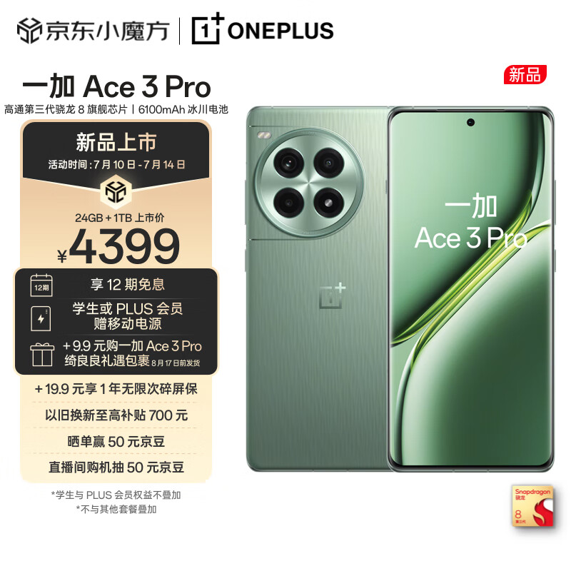 一加 Ace 3 Pro 24GB+1TB 绿野素青 第三代骁龙 8 旗舰芯片 6100mAh 冰川电池 AI智能游戏手机价格:4399.00元!