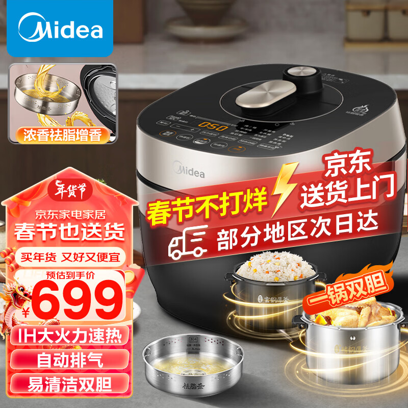 美的(Midea)低脂系列 全自动智能电锅5L家用双钢胆IH电磁加热自动排气上蒸下煮高压锅YL50P701(2-10人)价格:789.00元!