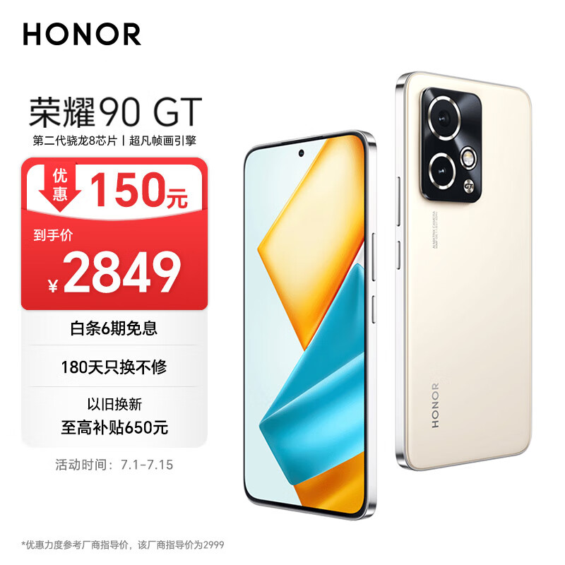 荣耀90 GT 第二代骁龙8旗舰芯 超凡帧画引擎 荣耀绿洲护眼屏 5000mAh轻薄长续航 OIS 16+512 燃速金 5G直屏价格:2849.00元!