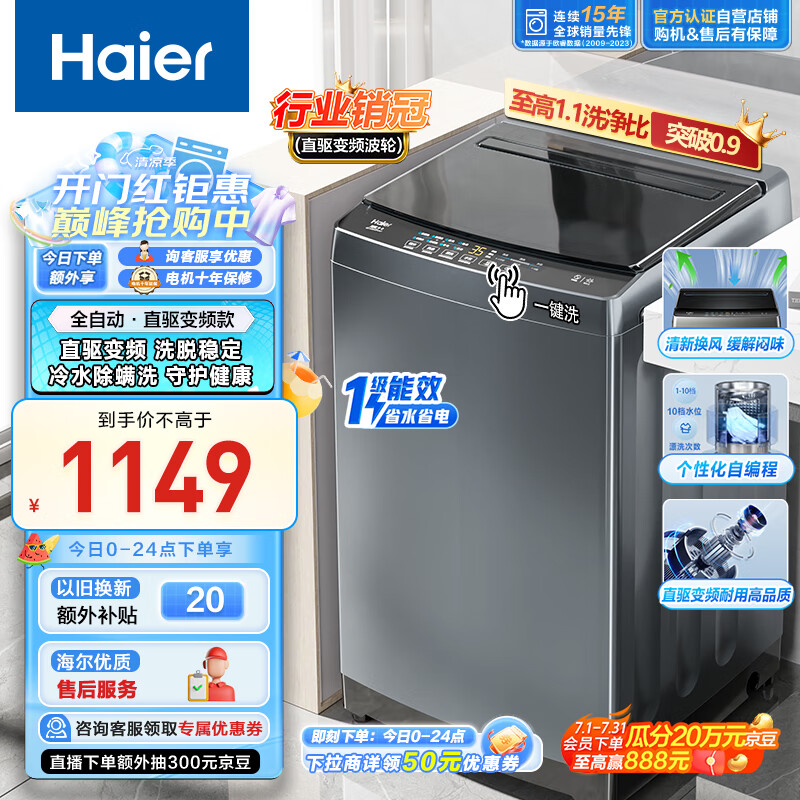 海尔(Haier)波轮洗衣机全自动家用 10公斤大容量 直驱变频 一级能效 智能预约 以旧换新EB100B32Mate1价格:1199.00元!