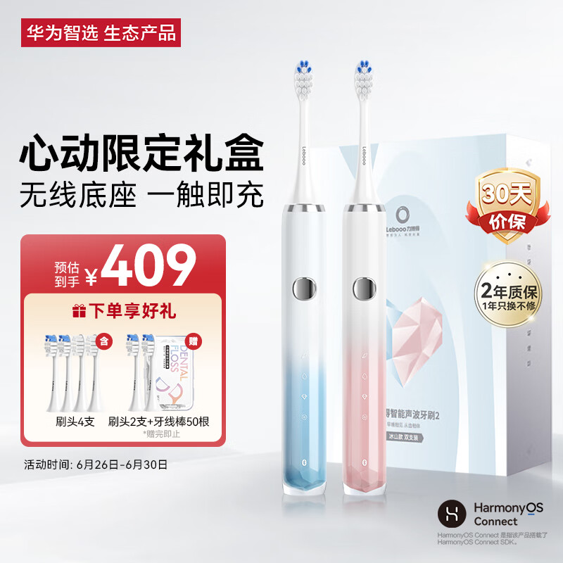 华为智选力博得电动牙刷 送男友送女友牙刷礼物 智能声波牙刷2冰山款 双支装(冰晶蓝+珊瑚粉)价格:409.00元!