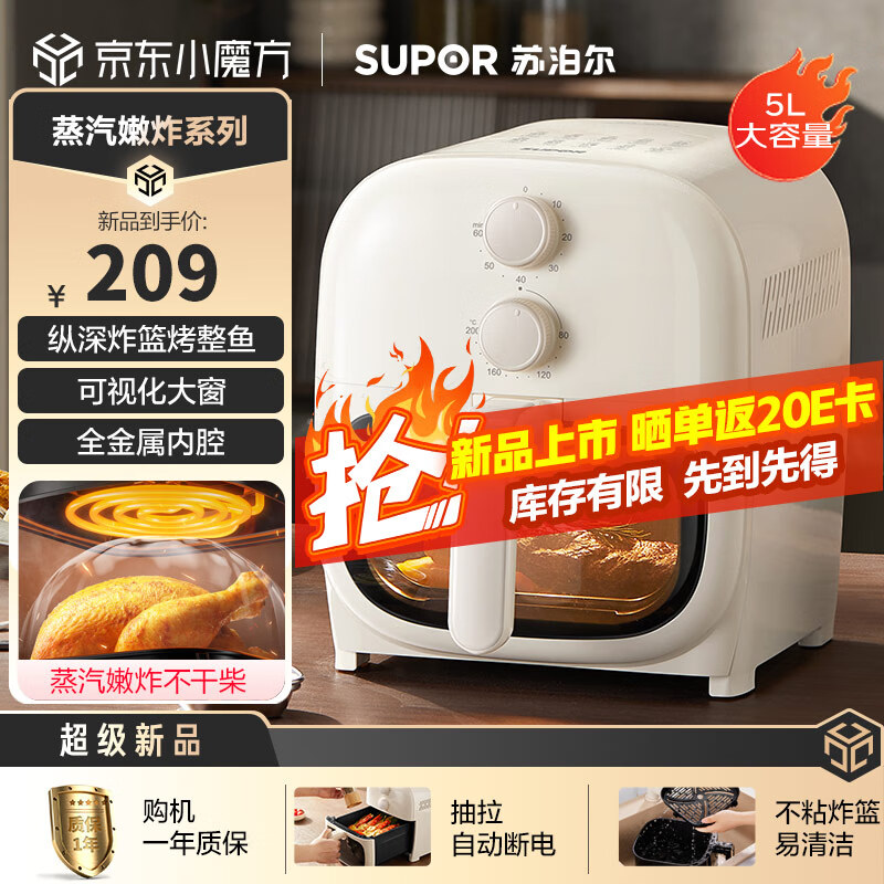 苏泊尔(SUPOR)空气炸锅 可视 5L家用大容量 1300W大功率 空时控温 双旋钮 操作便捷空炸KJ50D806价格:209.00元!