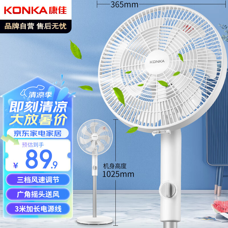 康佳(KONKA)电风扇家用七叶柔和大风量风扇低躁落地扇加长3米电源线KF-L17D升级款(延长线)价格:109.90元!