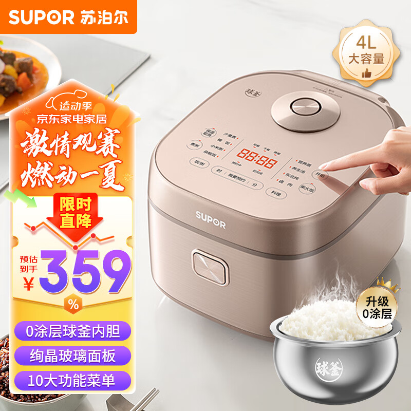 苏泊尔(SUPOR)0涂层球釜内胆电饭煲4L不锈钢内胆2-6人电饭锅 玻璃触控面板家用智能多功能无涂层电饭煲SF40FC699价格:359.00元!