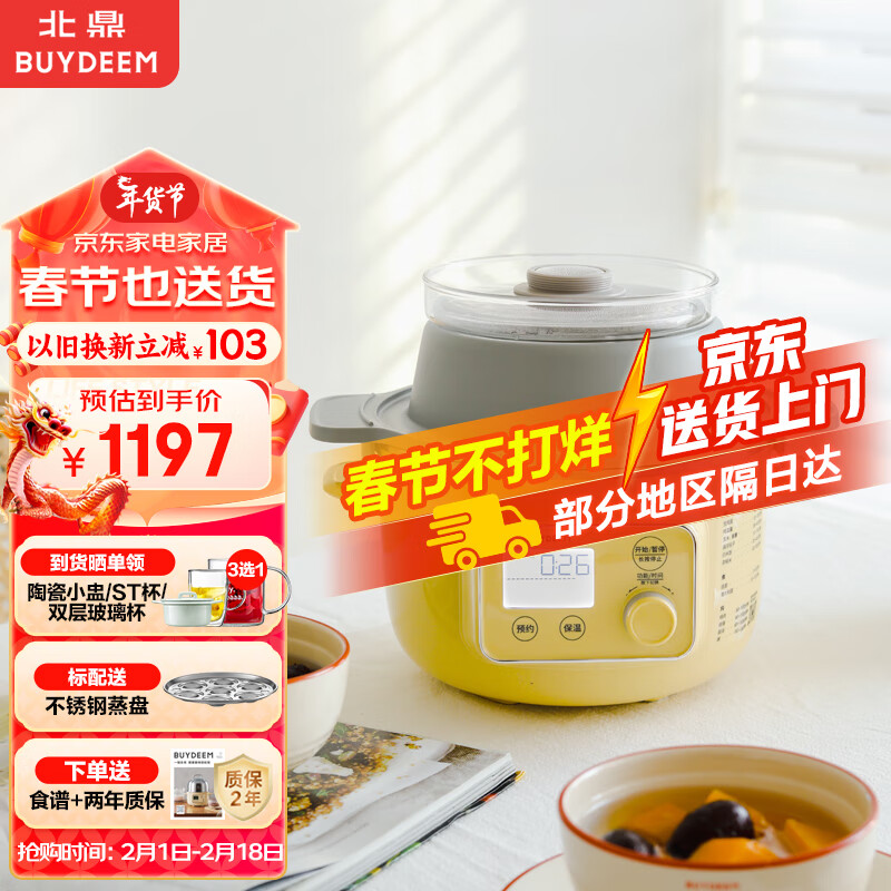 北鼎(Buydeem)家用迷你电煮锅电火锅多功能全自动预约多用途锅 【小鹅黄G37 含炖盅+陶瓷蒸蛋盘】年货送长辈价格:1197.00元!
