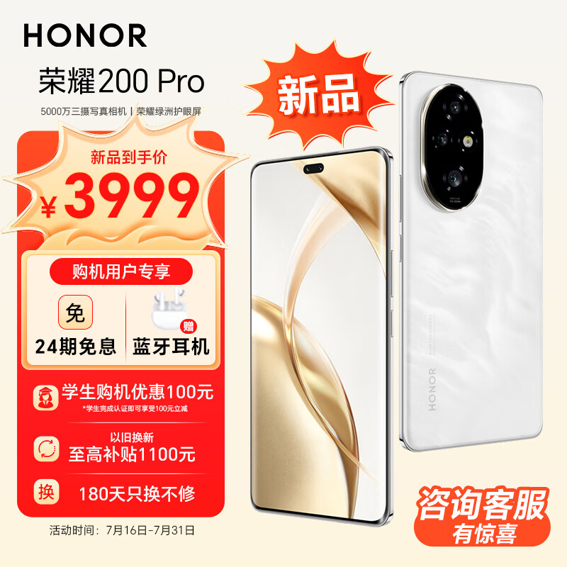 荣耀200 Pro 新品 旗舰级青海湖电池 绿洲护眼屏 雅顾光影主摄 第三代骁龙8s 16+512 月影白 5G AI手机价格:3999.00元!