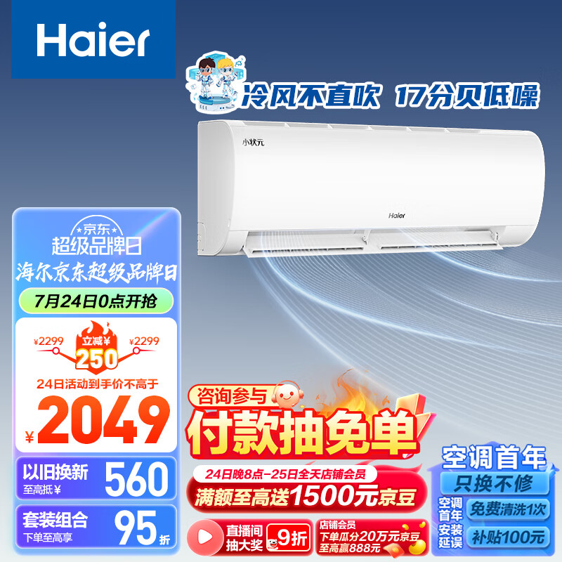 海尔(Haier)空调 小1匹 一级能效变频 冷暖 空调挂机 节能自清洁防直吹 卧室空调 KFR-22GW/01PAA81U1价格:1983.00元!