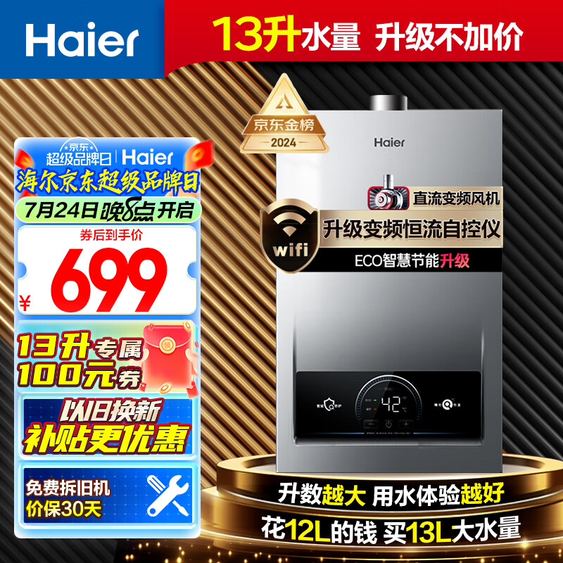 海尔(Haier)13升燃气热水器天然气 【优于12L】变频恒温节能 WIFI智控 低水压启动JSQ25-13MODEL(12T)以旧换新价格:799.00元!