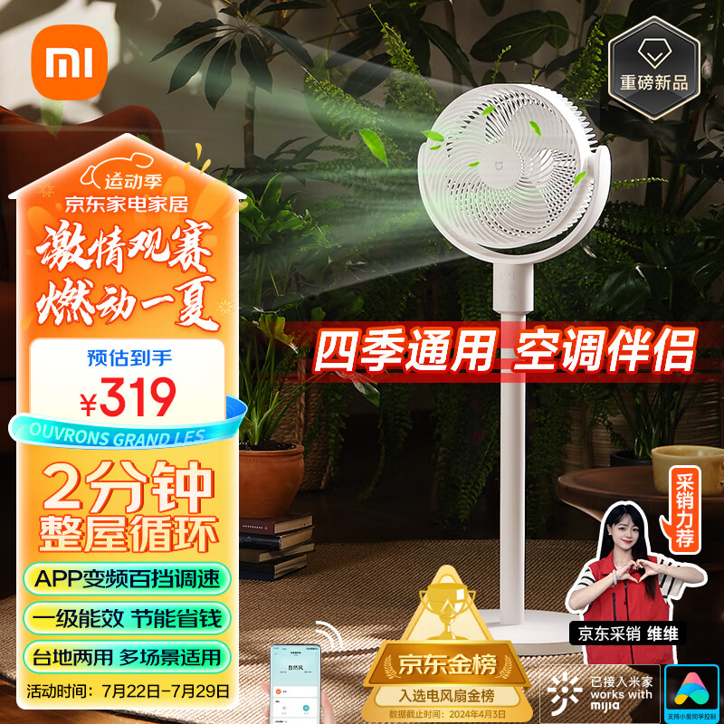 米家小米空气循环扇电风扇落地扇家用 直流变频大广角轻音节能台地两用 APP100档调节 智能控制价格:319.00元!