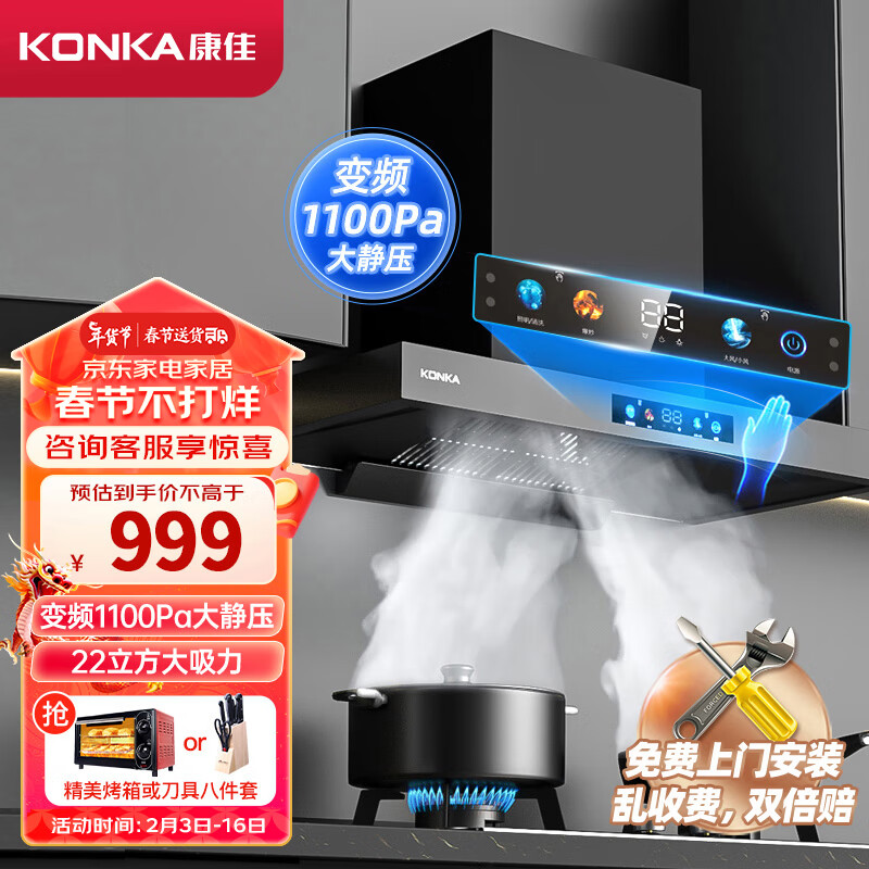 康佳(KONKA)欧式抽油烟机 变频1100Pa大静压 家用22立方爆炒大吸力 8档风速顶吸式排烟机 CXW-280-KT60B价格:1099.00元!