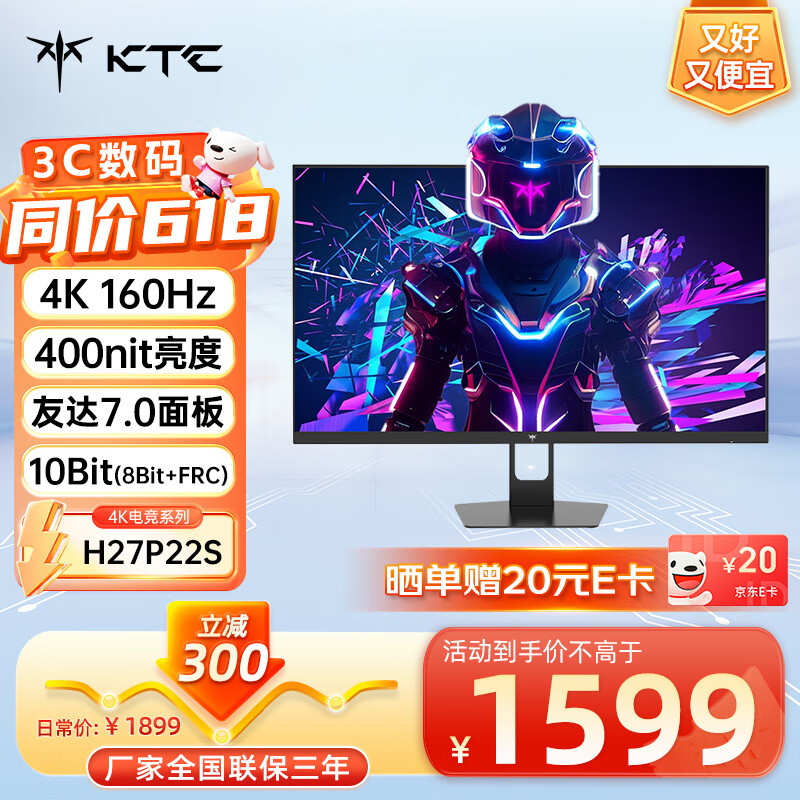 KTC 27英寸 电脑显示器 原生4k160Hz FastlPS屏 1ms HDR400 100%SRGB壁挂 电竞4K显示屏 H27P22S价格:1599.00元!
